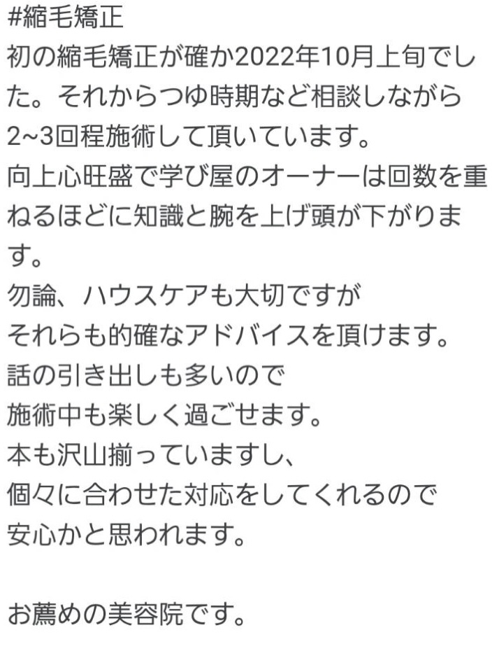 1度の施術では改善しきれない部分(切れ毛やビビり毛など)があるので徹底的なホームケア。毎月の髪質改善艶髪トリートメントが必須。